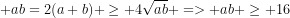 Từ giả thiết ta có \geq 4\sqrt{ab} => ab \geq 16)